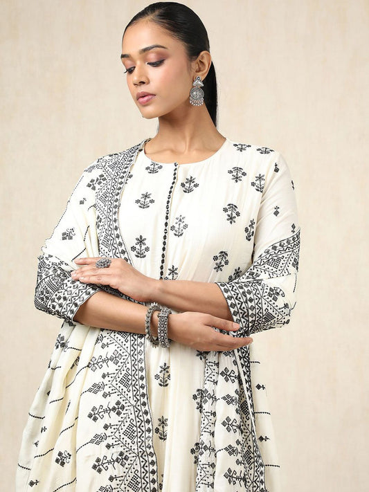 B4G1Vendor:Dhiyona SODhiyona SO Women's Floral Embroidered Thread Work Pure Cotton A-Line Kurta With Trousers And Dupatta