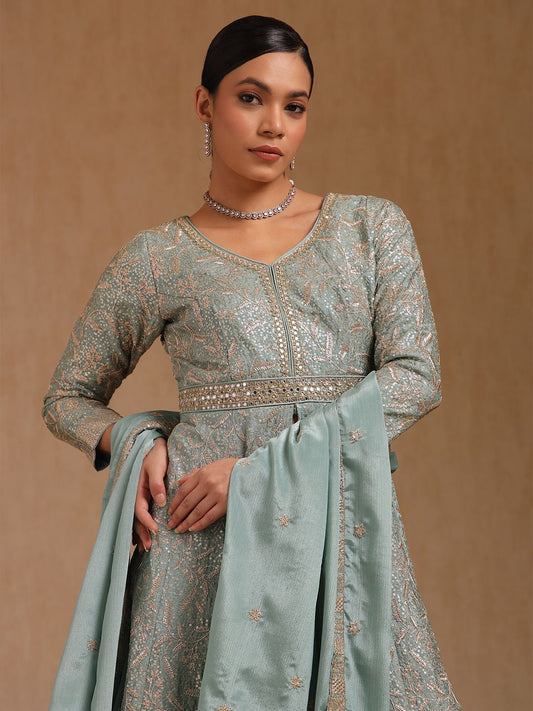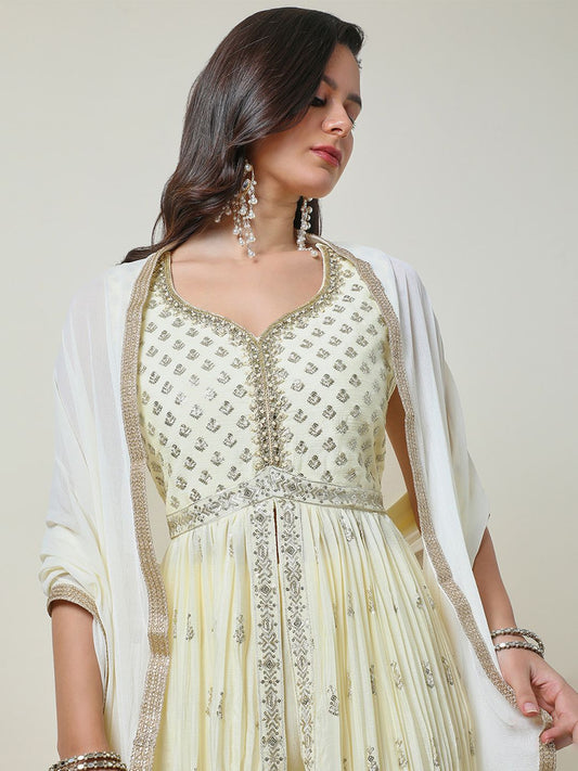 Dhiyona SO Women's Floral Embroidered V-Neck Empire Sequinned Anarkali Kurta With Palazzo & Dupatta