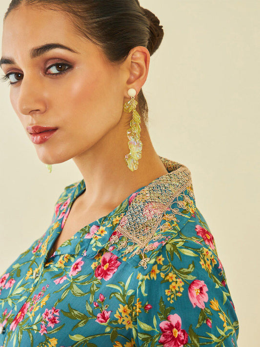 Dhiyona SO Women's Floral Printed Beads and Stones Kurta with Trousers