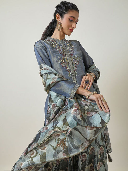 Dhiyona SO Women's Floral Embroidered Thread Work Tissue Straight Kurti with Palazzos & Dupatta