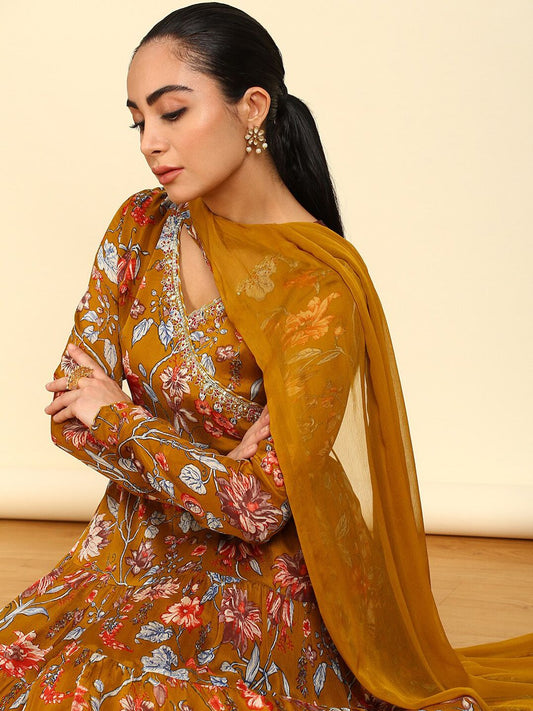 Dhiyona SO Women's Floral Printed Empire Sequinned Anarkali Kurta with Palazzos & Dupatta