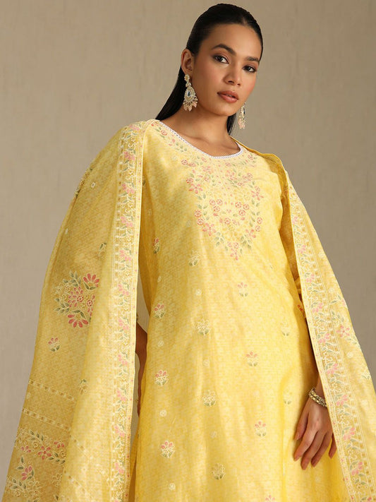 Dhiyona SO Women's Floral Embroidered V-Neck Chanderi Cotton Straight Kurta With Palazzos & Dupatta