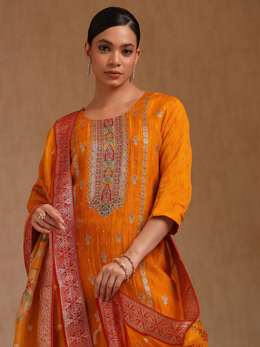 Dhiyona SO Women's Floral Embroidered V-Neck Zari Straight Kurta & Trousers With Dupatta