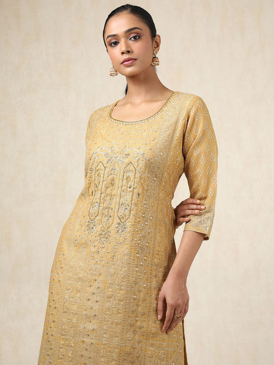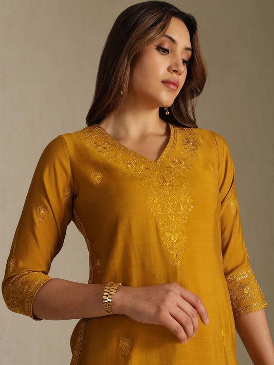 Dhiyona SO Women's Floral Embroidered V Neck Zari Work Silk Crepe Kurta With Palazzos