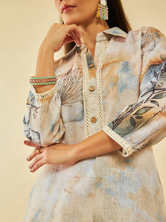 Dhiyona SO Women's Floral Printed Shirt Collar Beads And Stones Kaftan Kurta With Trousers