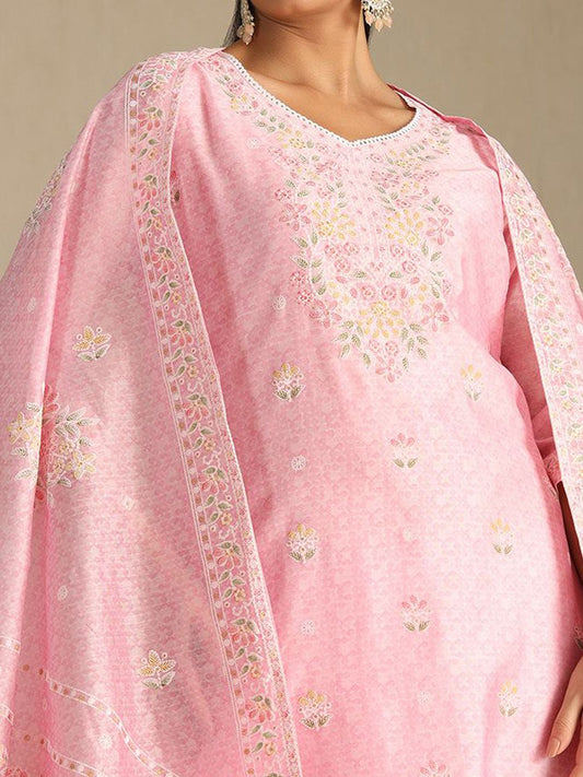 Dhiyona SO Women's Floral Printed Thread Work Chanderi Cotton Straight Kurta with Palazzos & Dupatta