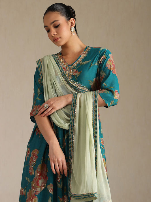 Dhiyona SO Women's Floral Printed V-Neck Zardozi Empire Anarkali Kurta With Trousers & Dupatta