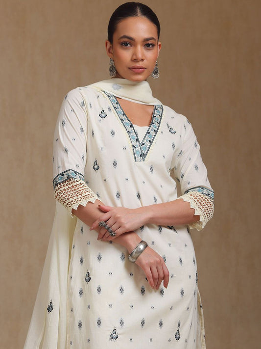 Dhiyona SO Women's Floral Printed Square Neck Thread Work Cotton Straight Kurta With Trousers & Dupatta