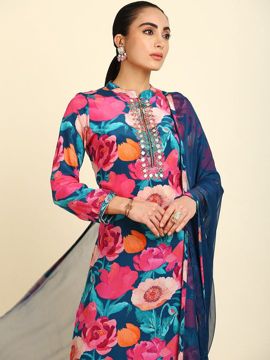 Dhiyona SO Women's Floral Printed Thread Work Mandarin Collar Straight Kurta With Trousers & Dupatta