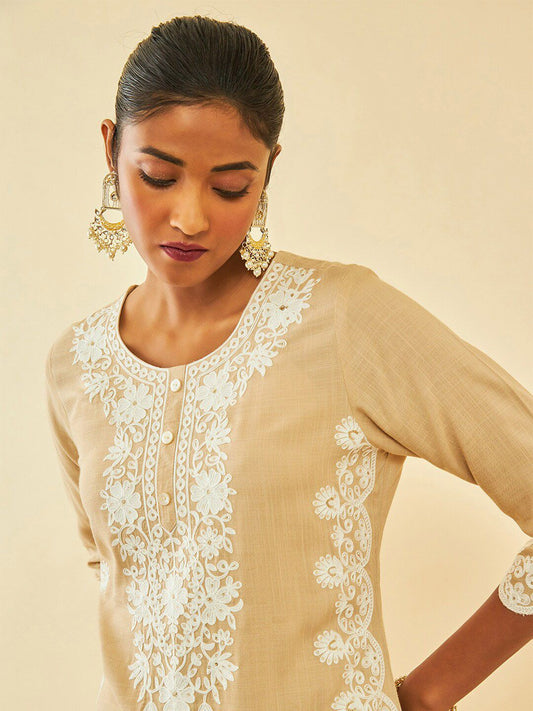 Dhiyona SO Women's Floral Yoke Design Round Neck Thread Work A-Line Kurta With Trousers
