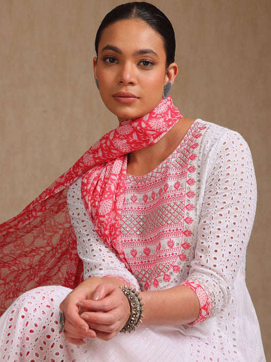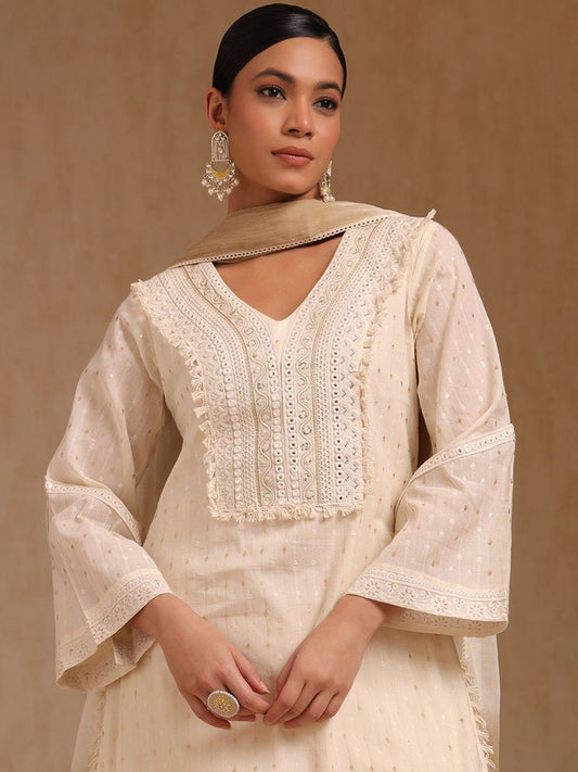 Dhiyona SO Women's Floral Yoke Design Notch Neck Muslin Zari Straight Kurta With Trousers & Dupatta