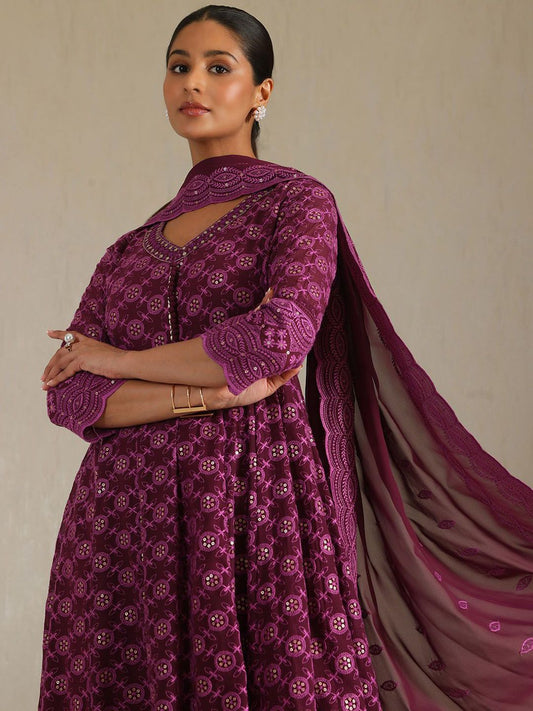 Dhiyona SO Women's Geometric Embroidered Thread Work Georgette Anarkali Kurta With Trousers And Dupatta