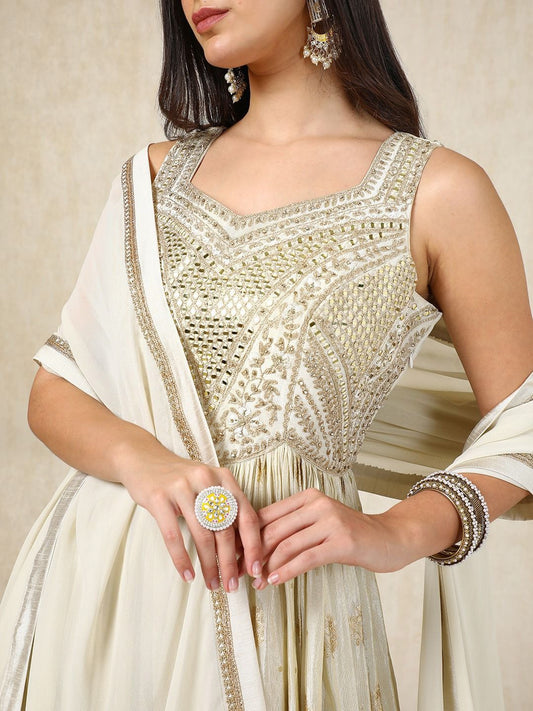Dhiyona SO Women's Floral Woven Design Angrakha Mirror Work Anarkali Kurta with Churidar & Dupatta
