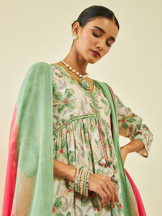 Dhiyona SO Women's Green Floral Printed Empire Mirror Work Pure Cotton Kurta with Trousers & Dupatta