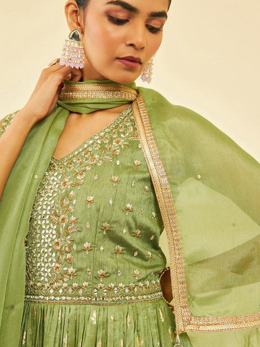 Dhiyona SO Women's Green Ethnic Motifs Embroidered Mirror Work Anarkali Kurta with Churidar & Dupatta