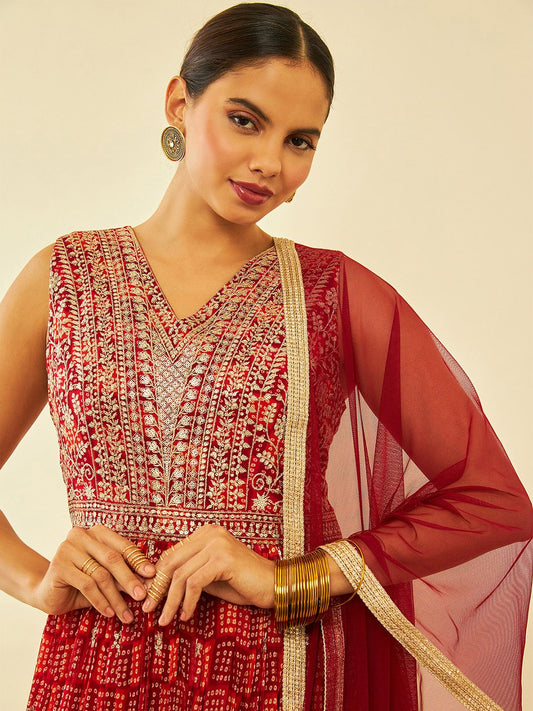 Dhiyona SO Women's Maroon Bandhani Printed Thread Work Georgette Anarkali Kurta & Churidar With dupatta