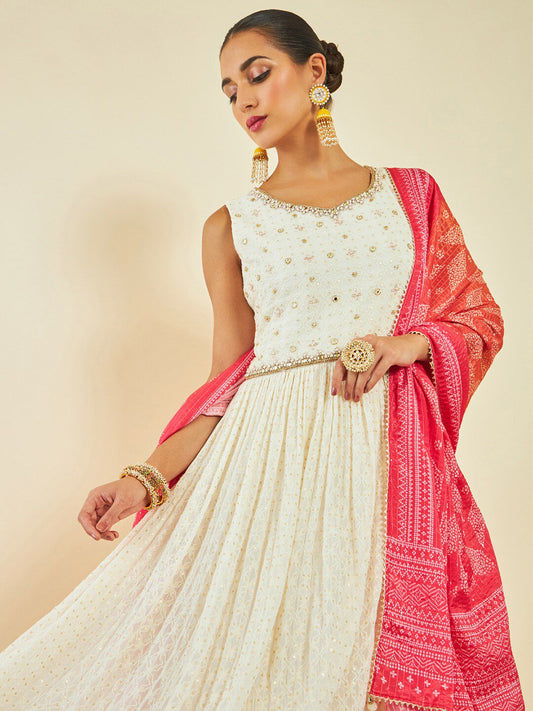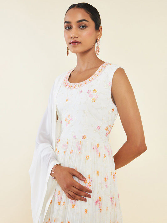 Dhiyona SO Women's Off White Floral Embroidered Sequinned Anarkali Kurta With Churidar & Dupatta