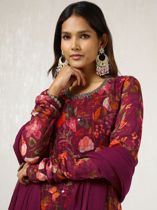 Dhiyona SO Women's Maroon Floral Printed Beads and Stones Kurta With Trousers & Dupatta