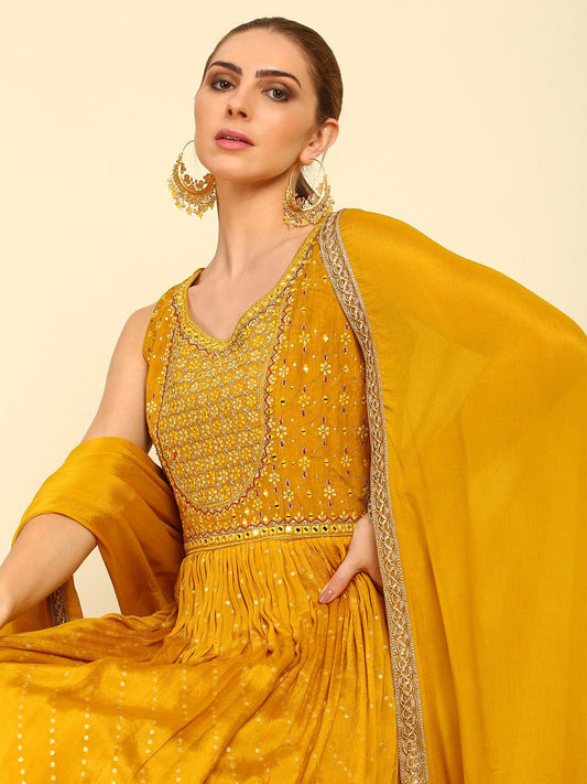 Dhiyona SO Women's Mustard Yellow Floral Embroidered Sequinned Anarkali Kurta with Churidar & Dupatta