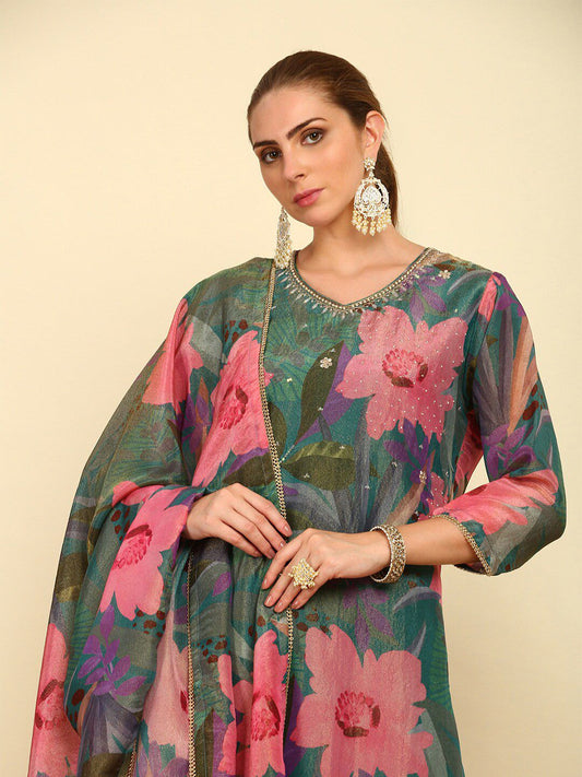 Dhiyona SO Women's Green Floral Printed Regular Beads & Stones Kurta With Trousers & Dupatta