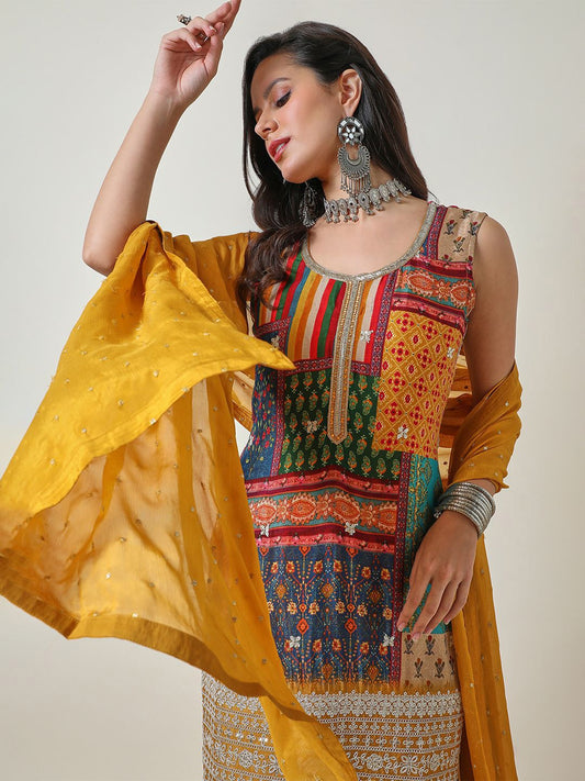 Dhiyona SO Women's Mustard Yellow Floral Printed Sequinned A-Line Kurta with Trousers & Dupatta