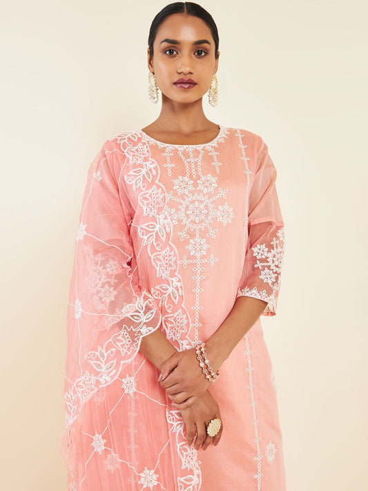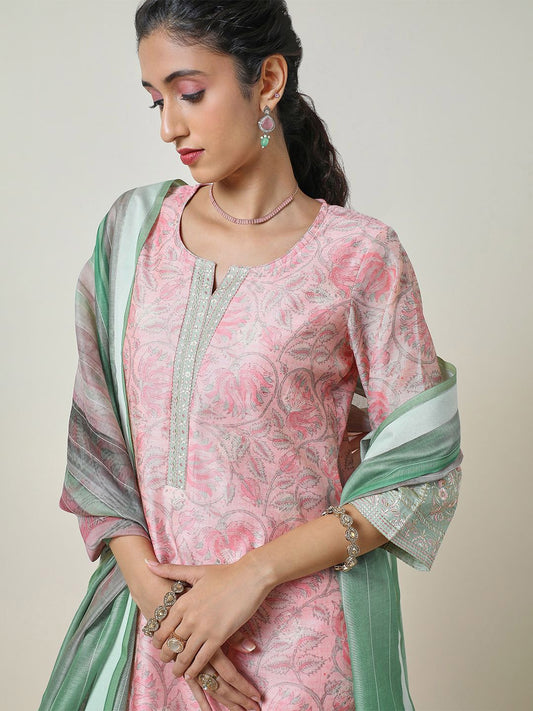 Dhiyona SO Women's Pink & White Floral Embroidered Chanderi Silk Kurta With Trousers & Dupatta