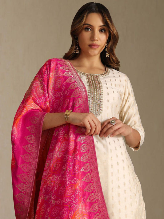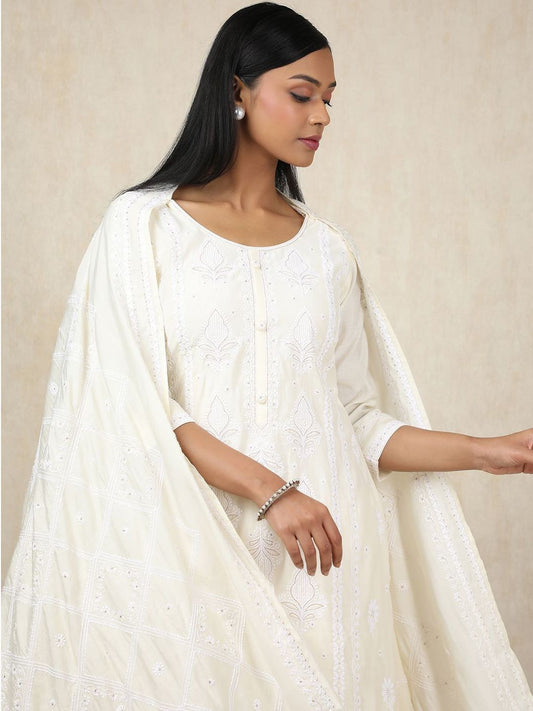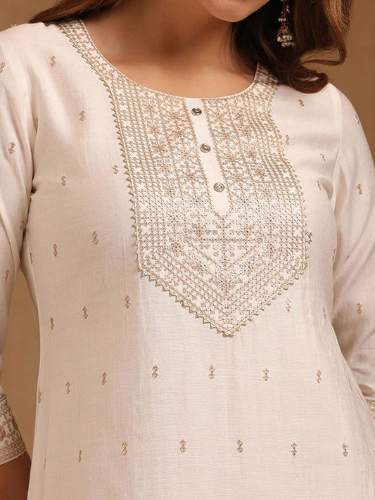 Dhiyona SO Women's Women Ethnic Motifs Embroidered Regular Thread Work Chanderi Cotton Kurta with Trousers & With Dupatta