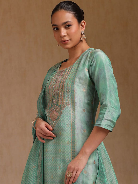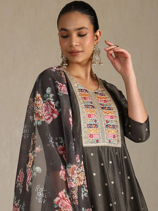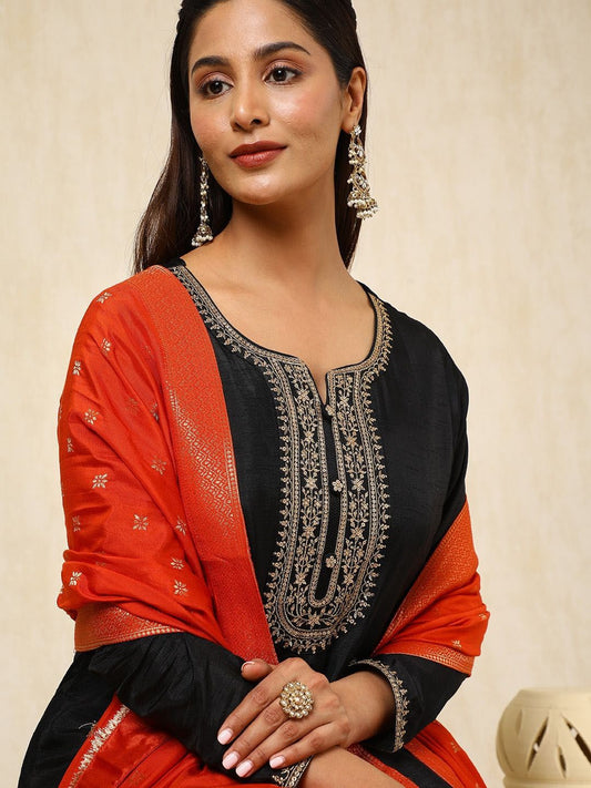 Dhiyona SO Women's Women Ethnic Motifs Embroidered Panelled Sequinned Dupion Silk Kurta with Trousers & With Dupatta