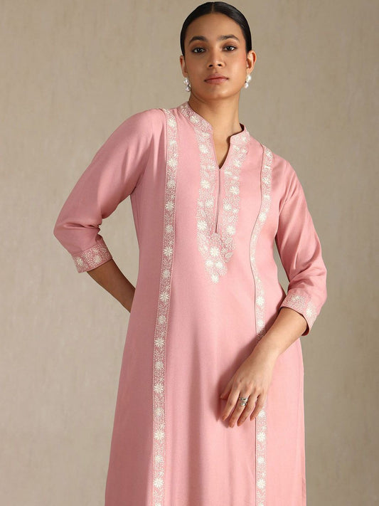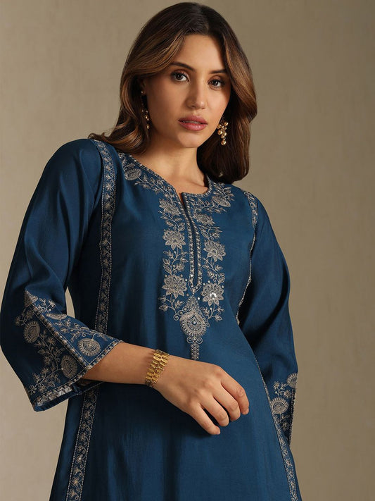 Dhiyona SO Women's Women Ethnic Motifs Embroidered Round Neck Sequinned Straight Kurta with Trousers