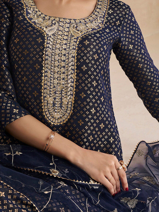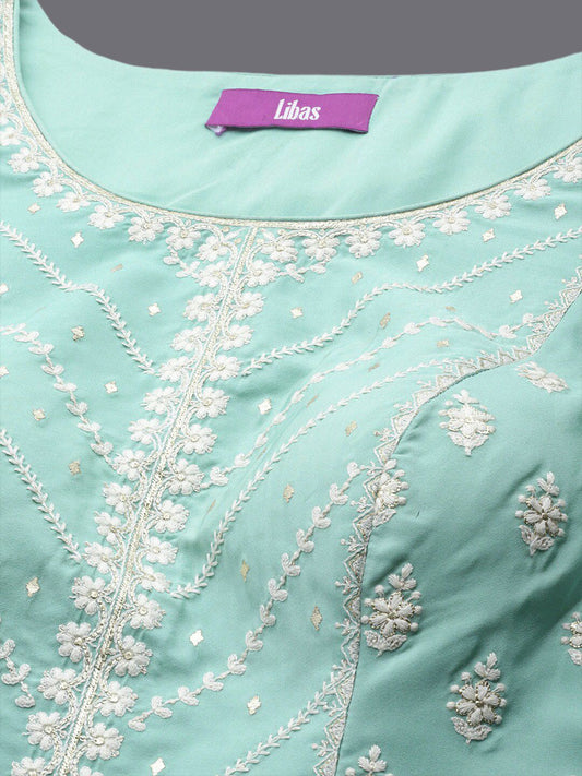 Dhiyona LL Libas Womens Blue Embroidered Silk Anarkali Kurti With Sharara & Dupatta