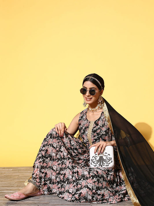Dhiyona VA Women Black Floral Printed Pleated Kurta with Sharara & With Dupatta