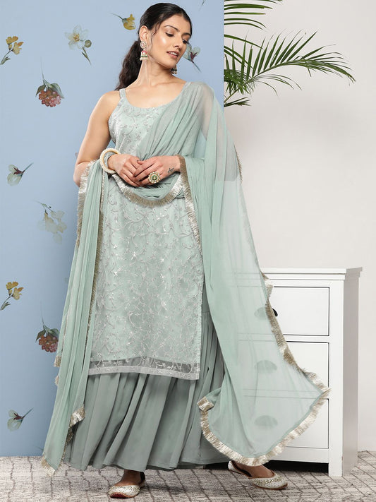 Dhiyona IN Green Sequinned Georgette Kurta & Sharara With Dupatta