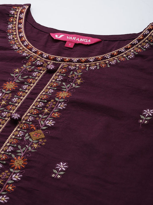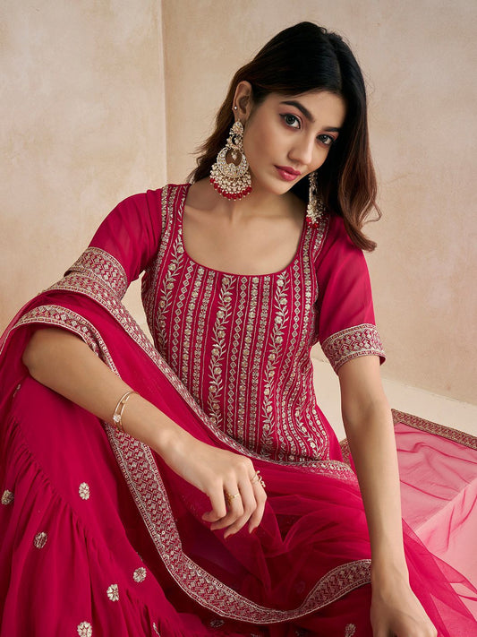 Dhiyona IN Magenta Floral Embroidered Straight Kurti & Sharara With Dupatta