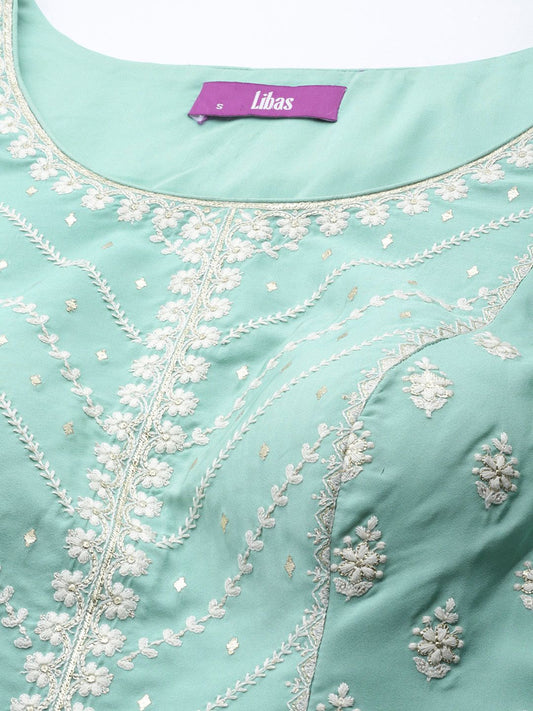 Dhiyona VA Women Green Embroidered Sequinned Kurta with Sharara & Dupatta
