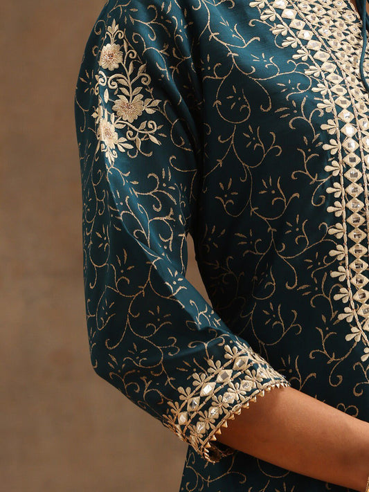Dhiyona LL Teal & Gold-Toned Embroidered Sequinned Pure Silk Kurta with Sharara & Dupatta