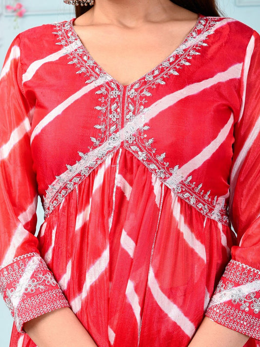 Dhiyona SN Red & White Leheriya Printed Thread Work Silk Kurta With Sharara & Dupatta