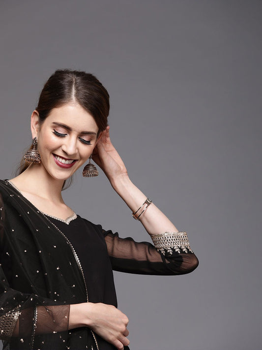 Dhiyona IN Women Black Georgette Kurti with Embroidered Sharara & Dupatta