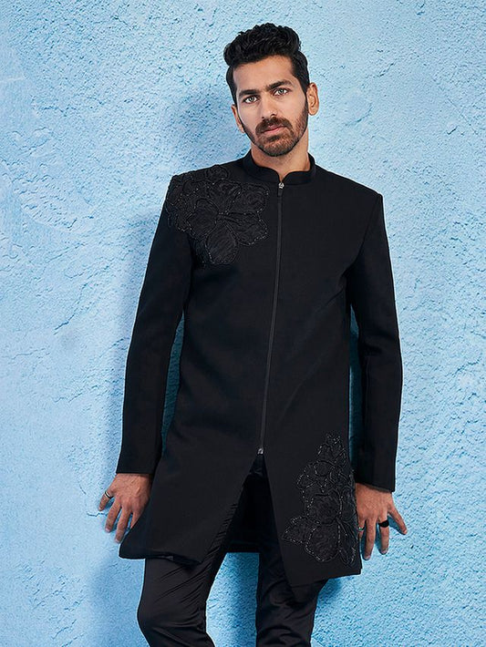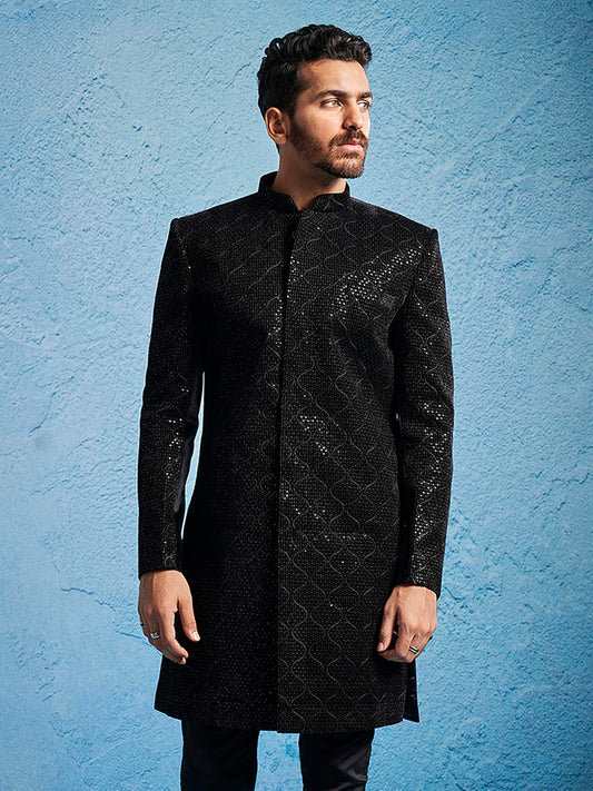 Men's Black Velvet Straight Sherwani Only Top