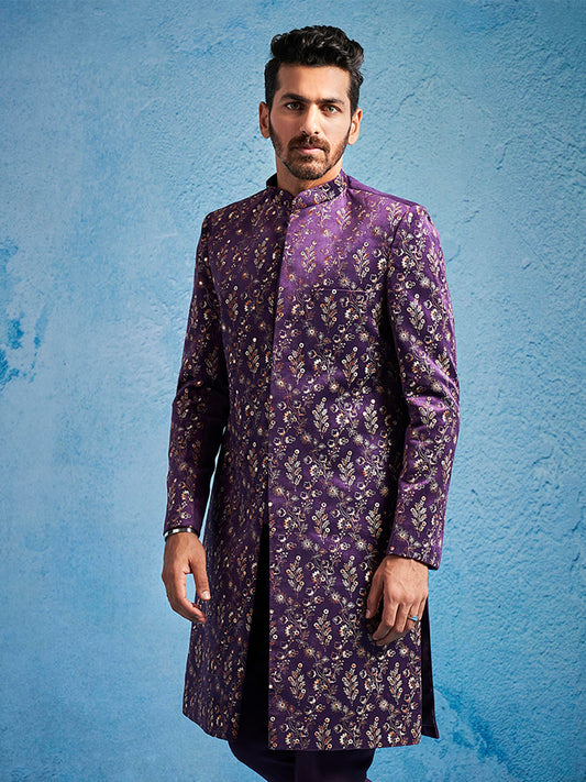 Men's Purple Velvet Straight Sherwani Set
