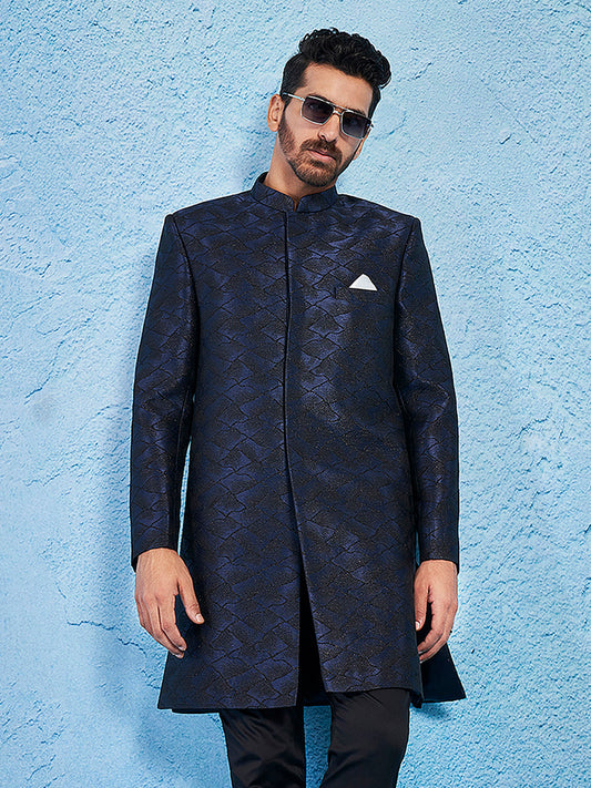 Men's Navy Blue Silk Blend Regular Sherwani Set