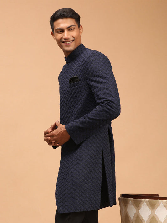Men's Navy Blue Silk Blend Straight Sherwani Set