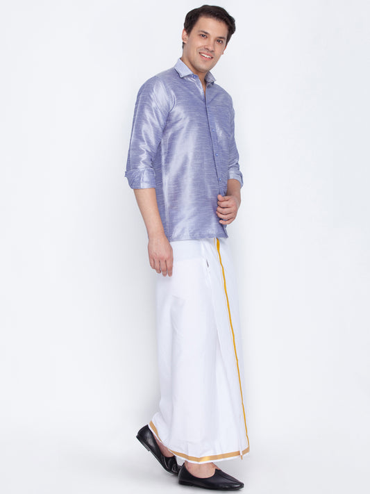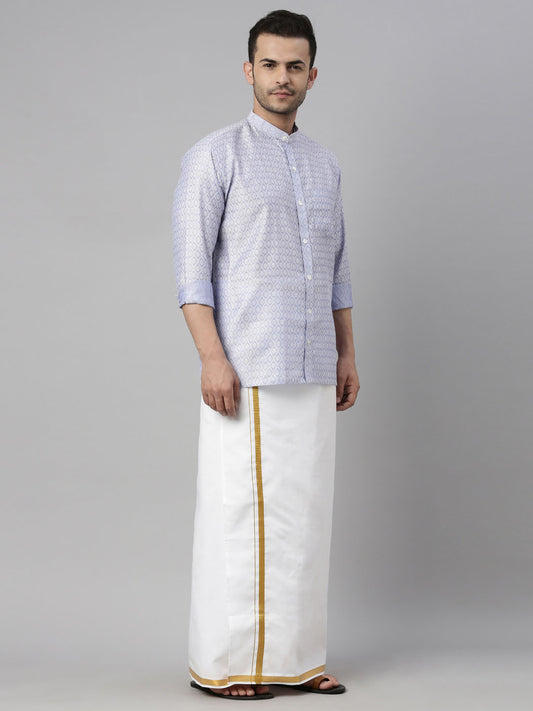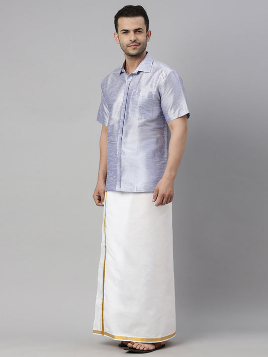 Men's Blue Silk Blend Straight Shirt And Mundu