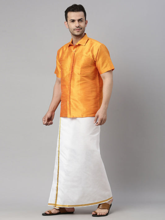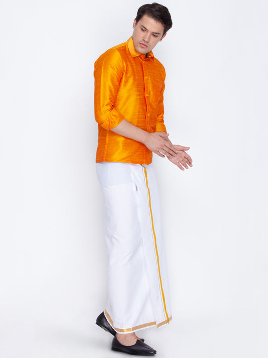 Men's Orange Silk Blend Straight Shirt And Mundu