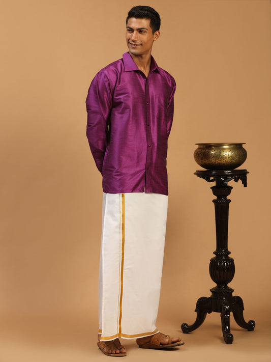Men's Purple Silk Blend Straight Shirt And Mundu