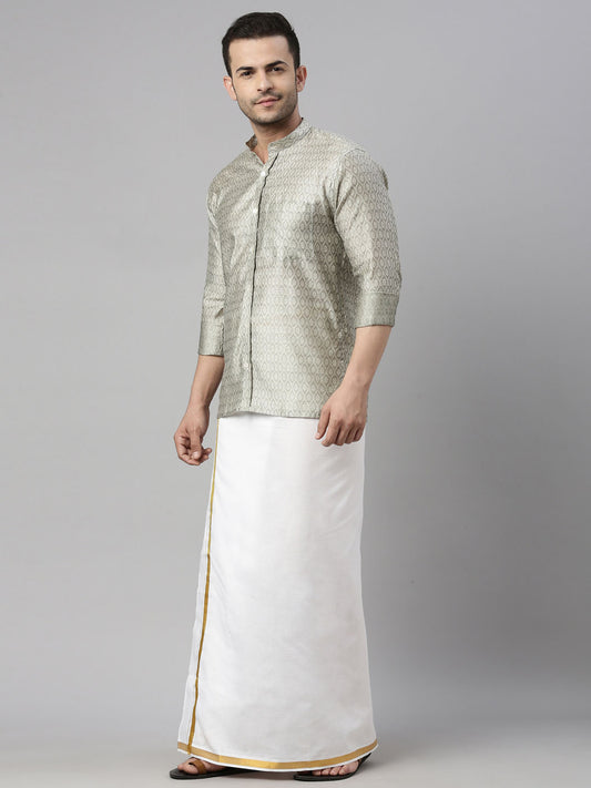 Men's Grey Silk Blend Straight Shirt And Mundu