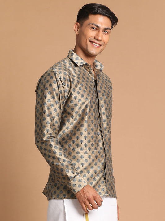 Men's Beige Silk Blend Straight Shirt And Mundu