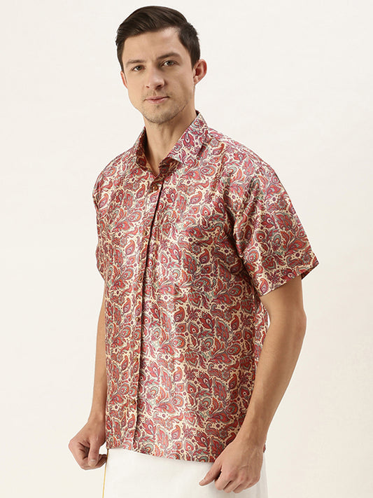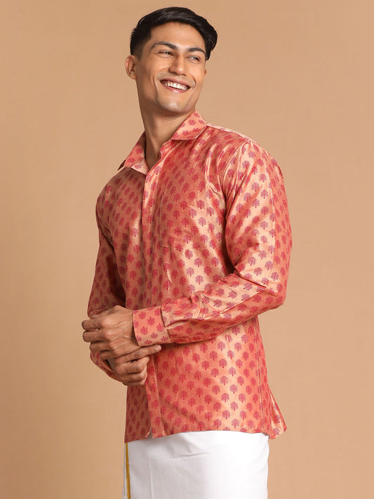 Men's MulticolorBasePink Silk Blend Straight Shirt And Mundu