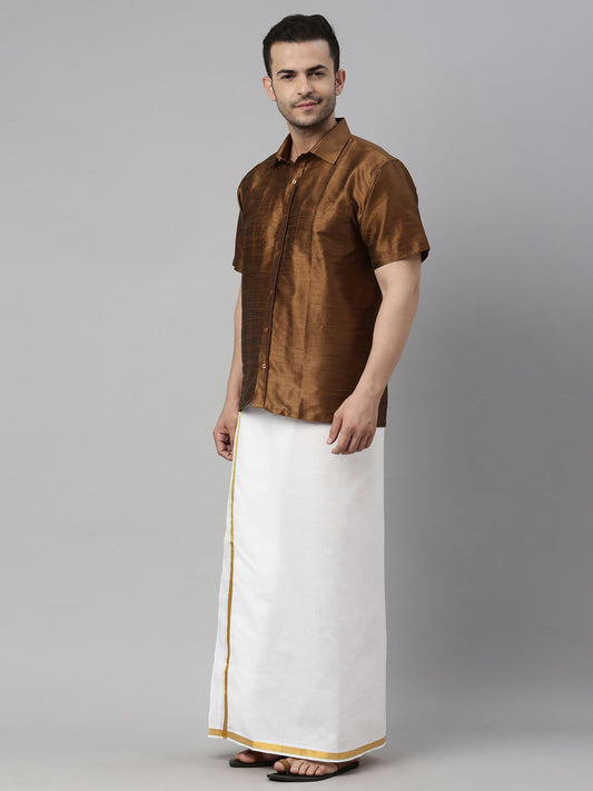 Men's Coffee Silk Blend Straight Shirt And Mundu