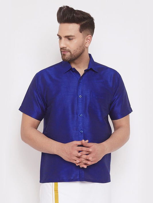 Men's Navy Blue Silk Blend Straight Shirt And Mundu