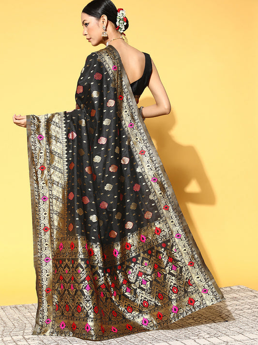 Women's Silk Blend Black Woven Design Designer Saree With Blouse Piece